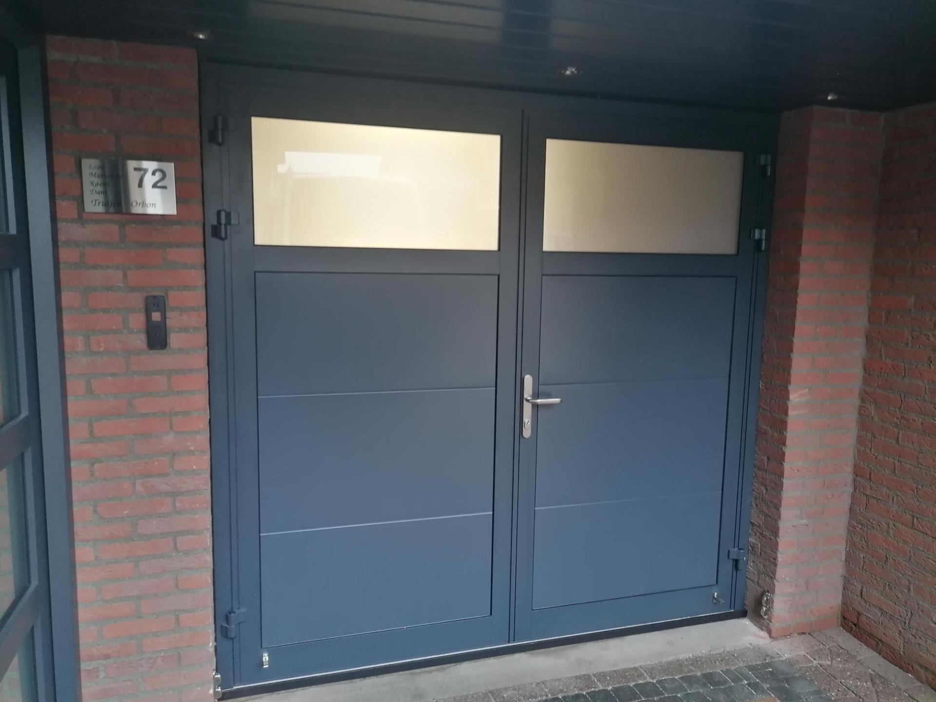 Naar buiten draaiende deuren. Toegangsdeur links of rechts geplaatst. Afmeting op maat gemaakt tot en met kozijn buitenmaat (breedte x hoogte) 2500mm x 2250mm. Groteren maten leverbaar tegen meerprijs.